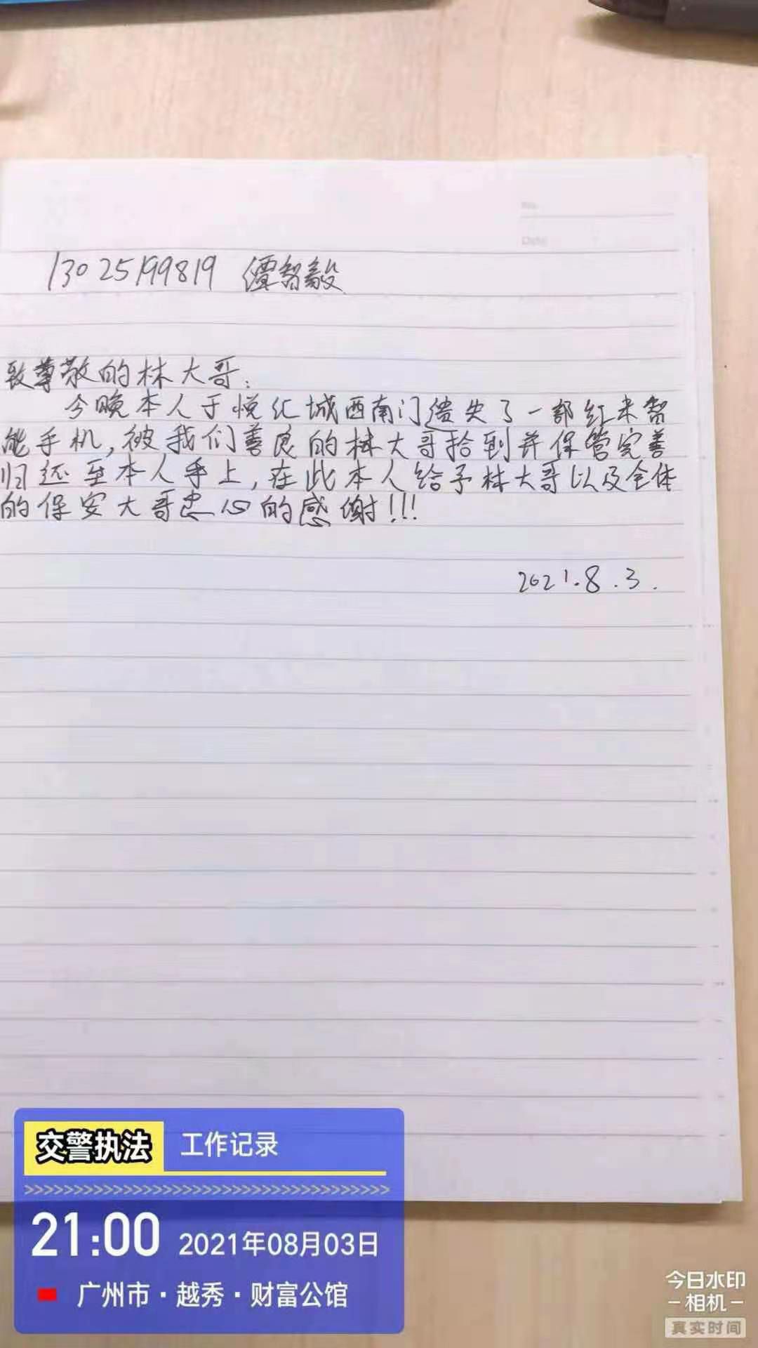 2021年8月3日,三亿体育·三亿官方网站-三亿(中国)驻西村悦汇城保安员林伟强像往常一样准备交接岗,当走至负一西南门门口的时候发现地上有一部黑色智能手机,林伟强在现场等待失主并上报了当班值班经理,不一会儿失主打电话过来,核实了失主身份后将失物归还。失主十分感动,并现场手写感谢信一封以表谢意。